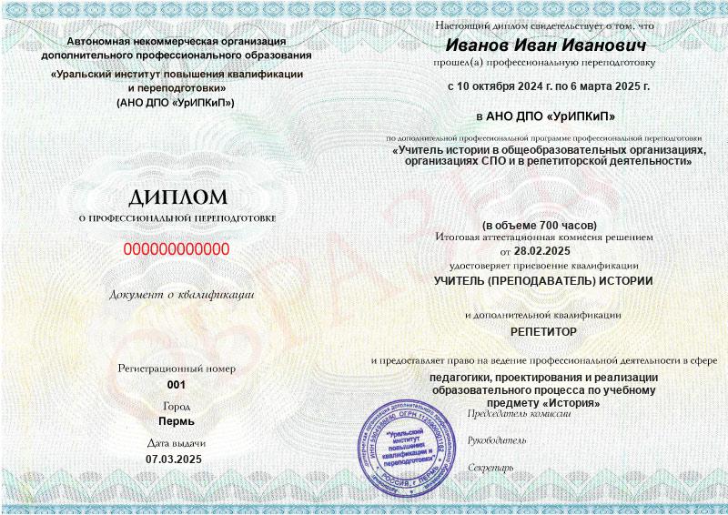 - Образец диплома о профессиональной переподготовке.